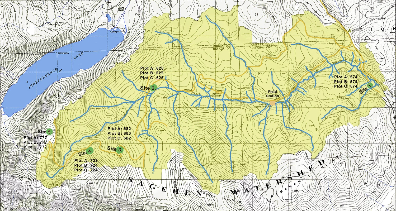 The sites were chosen for their commonality of earth type. Each site is approximately 150 meters above the prior one. Their placement spans a little over 750 meters of altitude from close to the lower portion to Carpenters Ridge, which is at the top of the Sagehen Drain Basin.